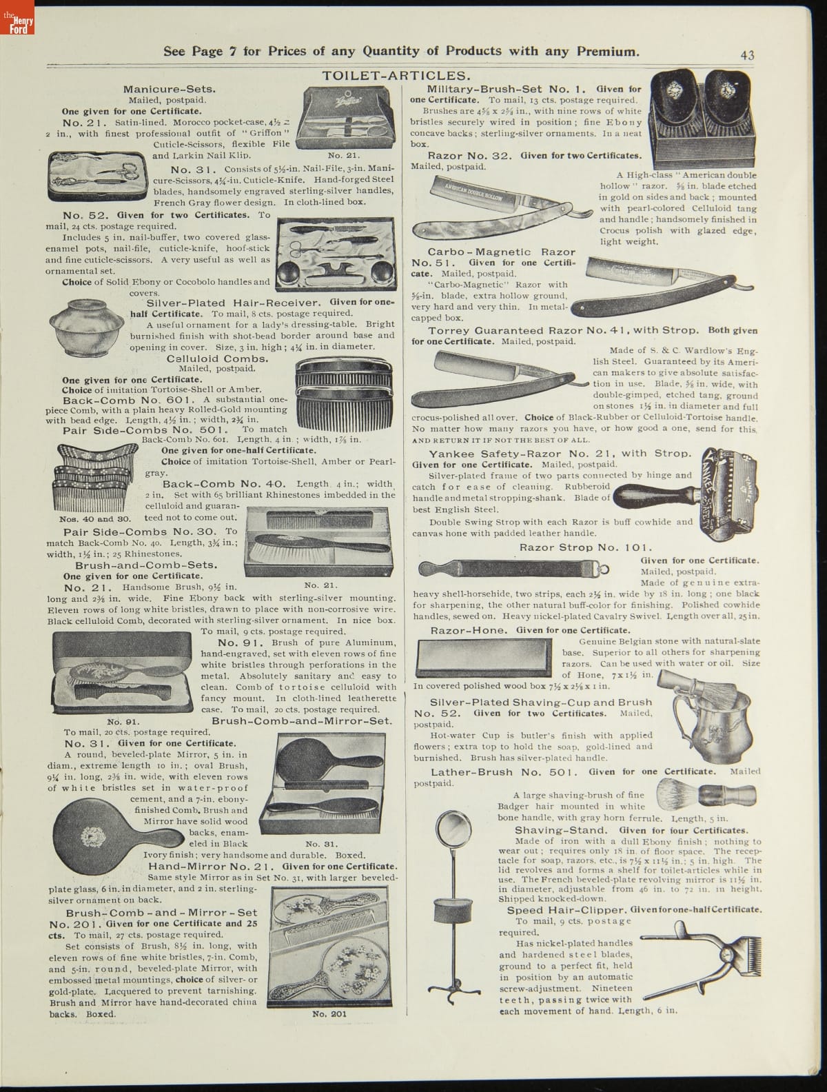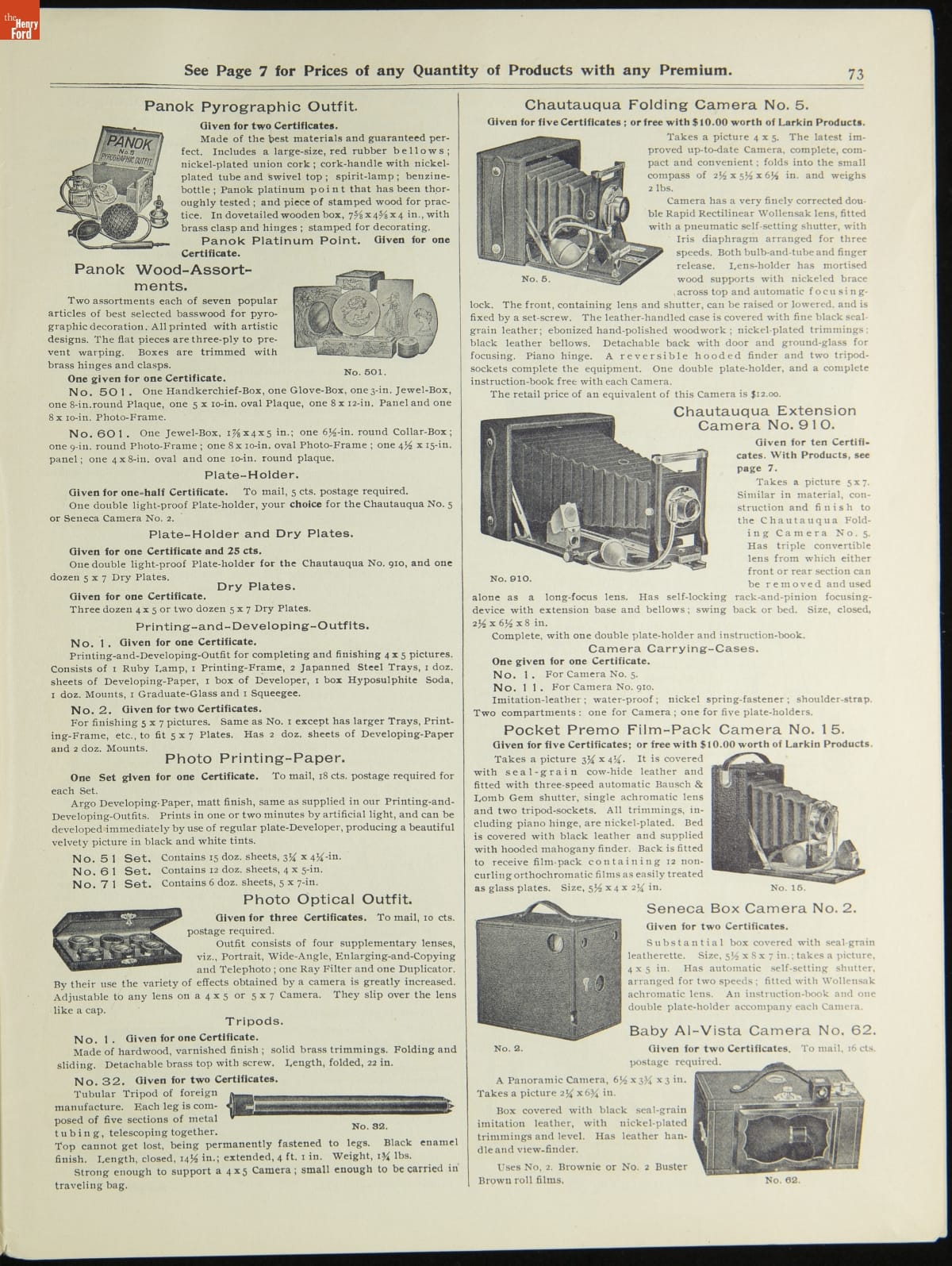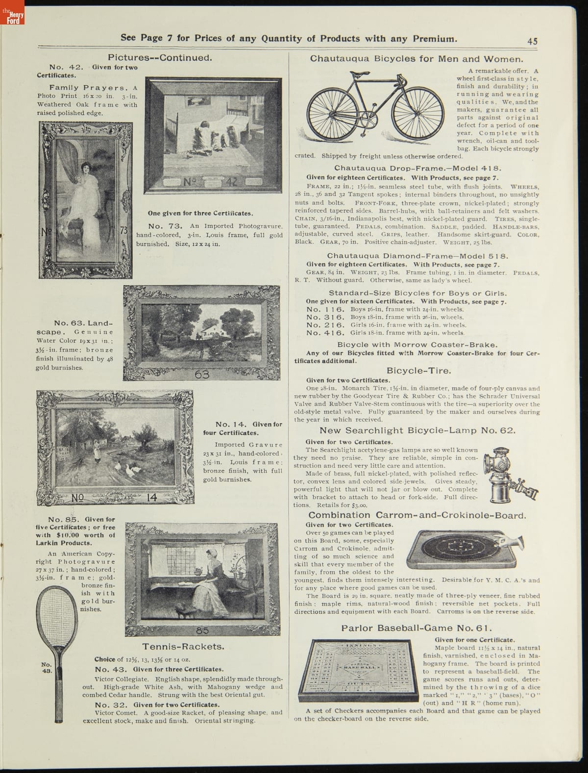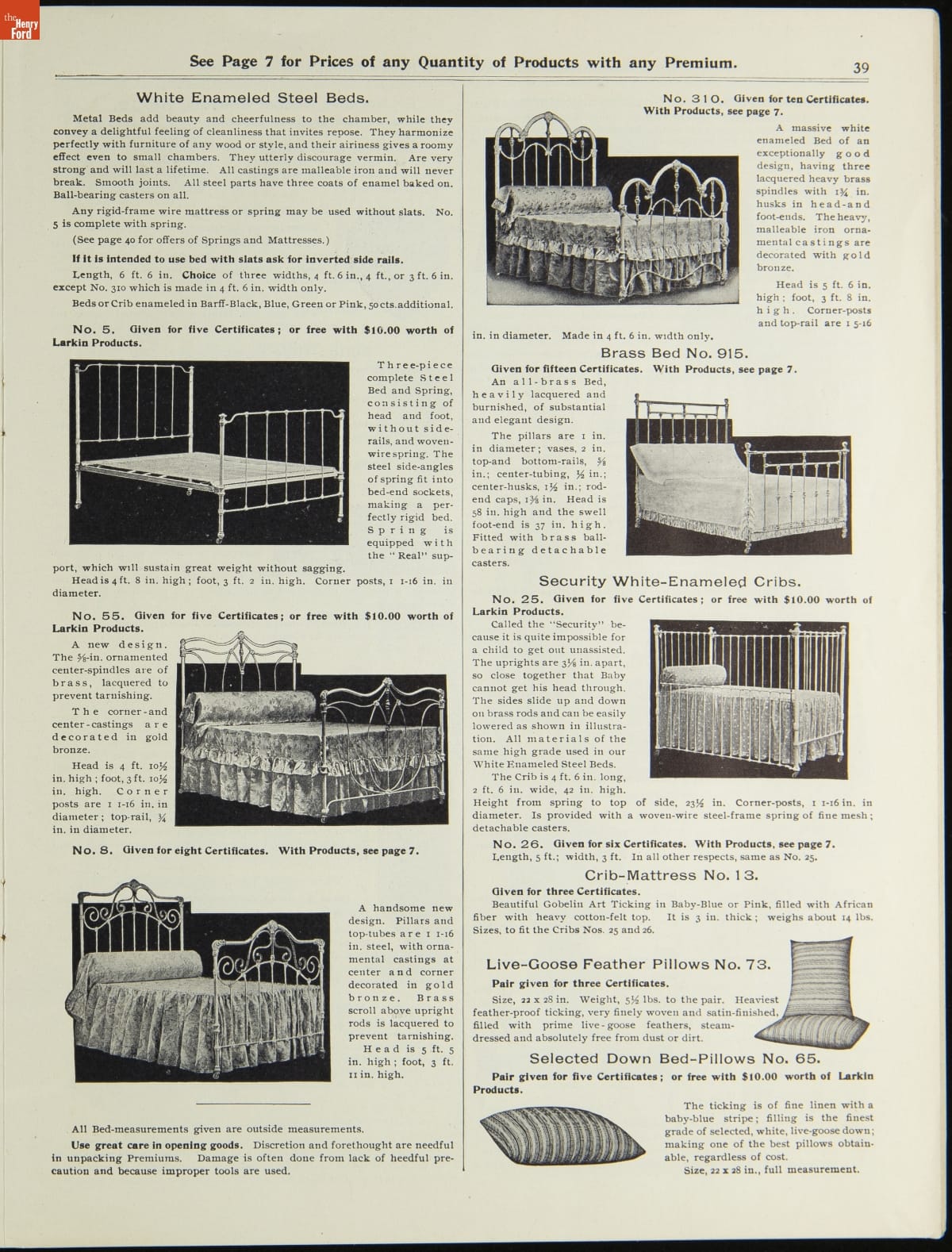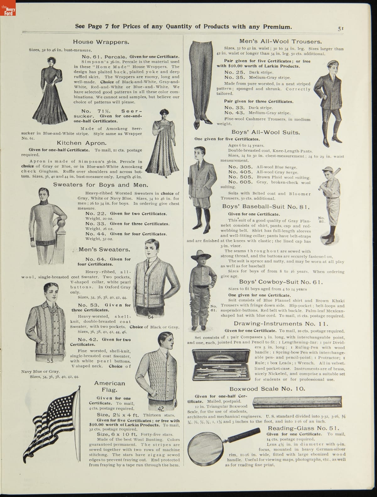 John D. Larkin established a soap manufacturing company in 1875. He hired his brother-in-law, Elbert Hubbard, as a salesman. Hubbard developed "The Larkin Idea," a plan that sold goods directly to consumers through mail-order catalogs and offered incentivizing giveaways. It was a success. By the early 1900s, Larkin's catalogs contained pages of products and even more pages of premiums from which customers could choose.
