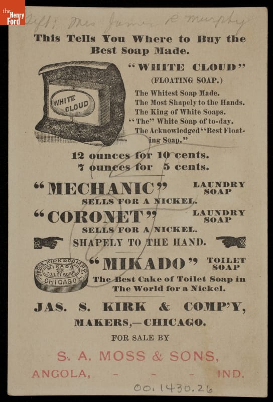 Trade Card for "White Cloud," "Mechanic," "Coronet," and "Mikado" Soap, James S. Kirk & Co., circa 1885