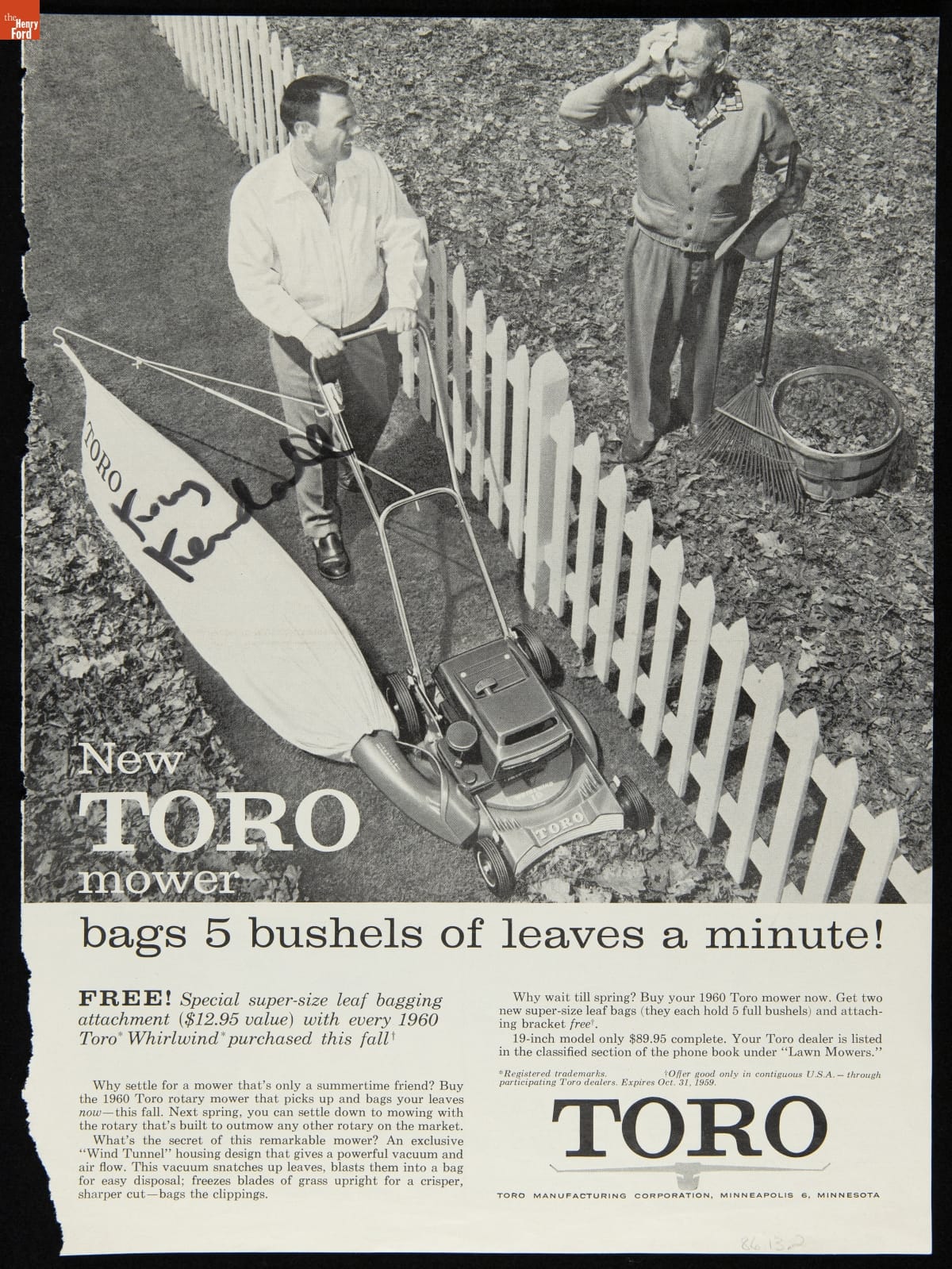 Advertisement, "New Toro Lawn Mower Bags 5 Bushels of Leaves a Minute!," 1960