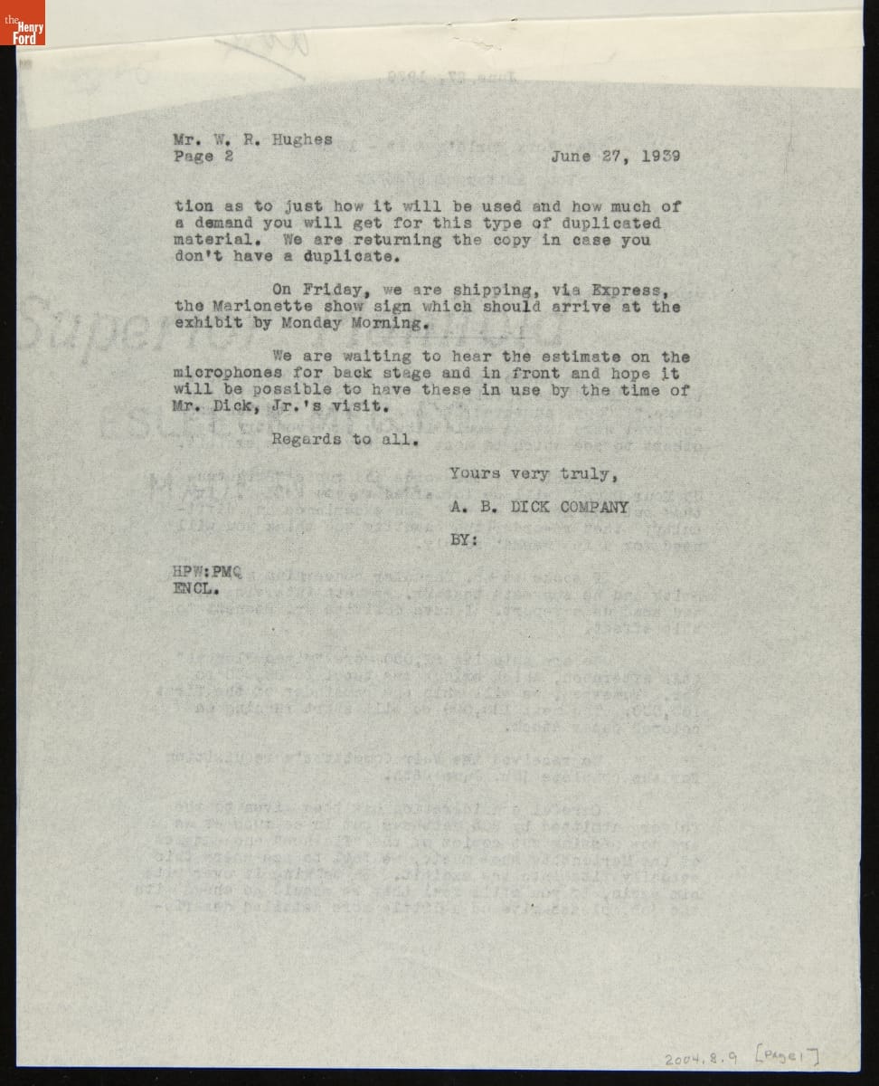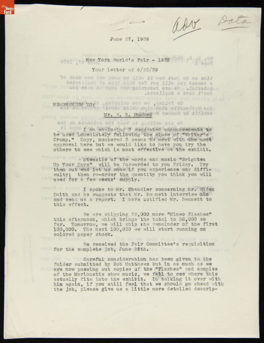 Memorandum regarding the A.B. Dick Company Mimeograph Exhibit at the 1939 New York World's Fair, June 27, 1939