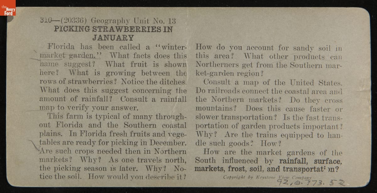 on left side: Keystone View Company / Manufacturers Publishers / Copyrighted / Made in U.S.A. on top, center: 310 / G on right side: Meadville, Pa., New York, N.Y. / Chicago, Ill., London, England on bottom, right: 20336 Picking Strawberries in January