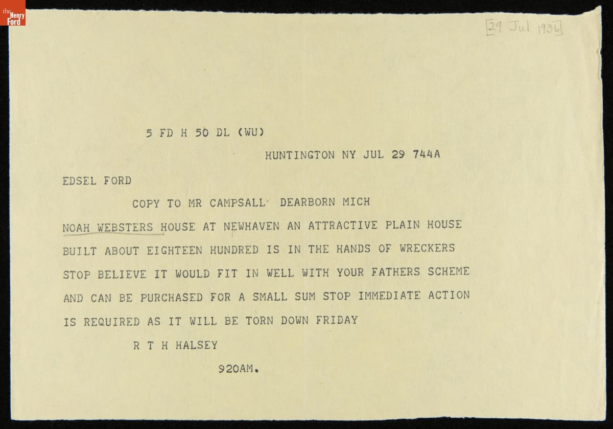R.T.H. Halsey Notifies Edsel Ford of the Imminent Demolition of Noah Webster Home in New Haven, Connecticut, July 29, 1936