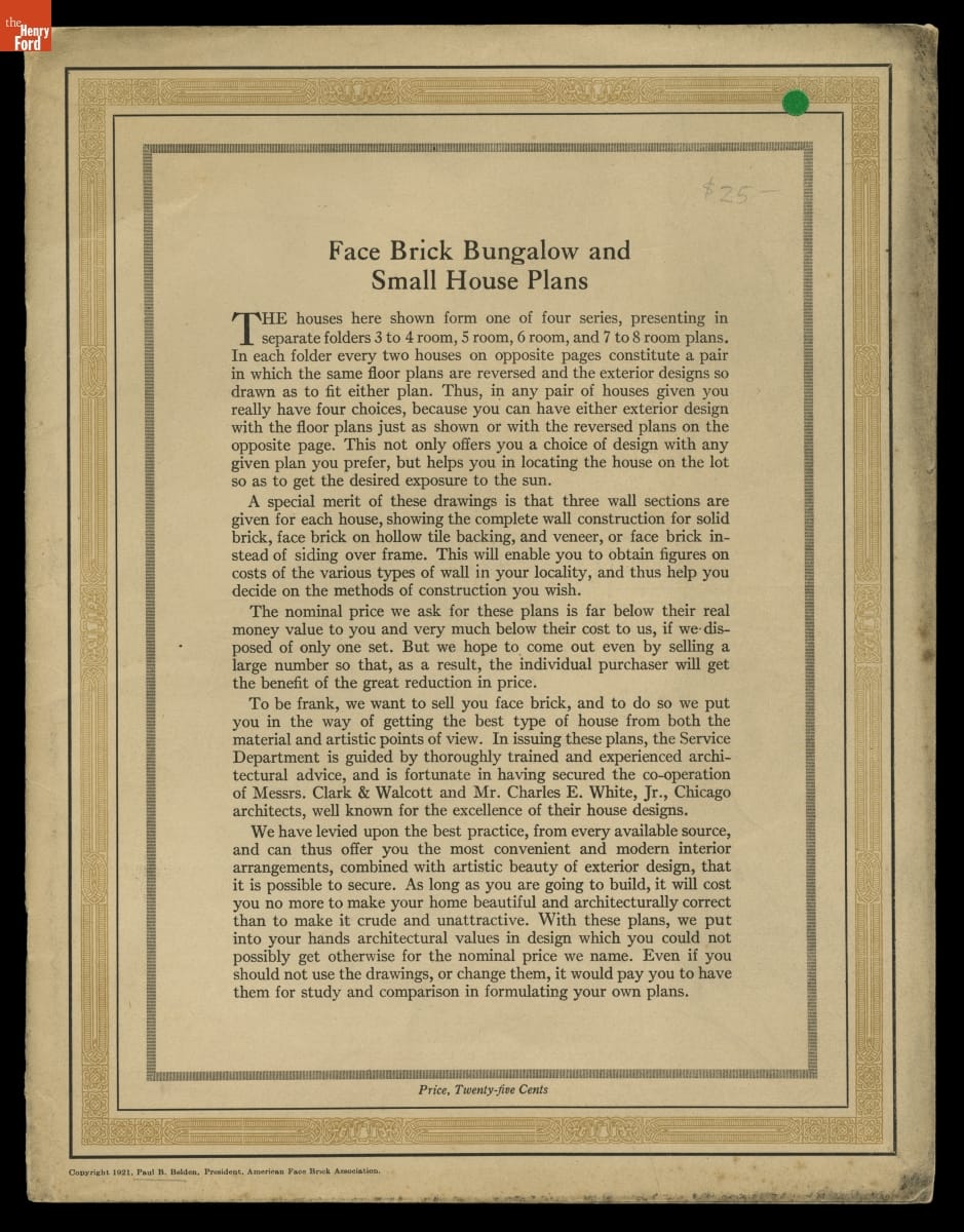 Face Brick Bungalow and Small House Plans, 1921