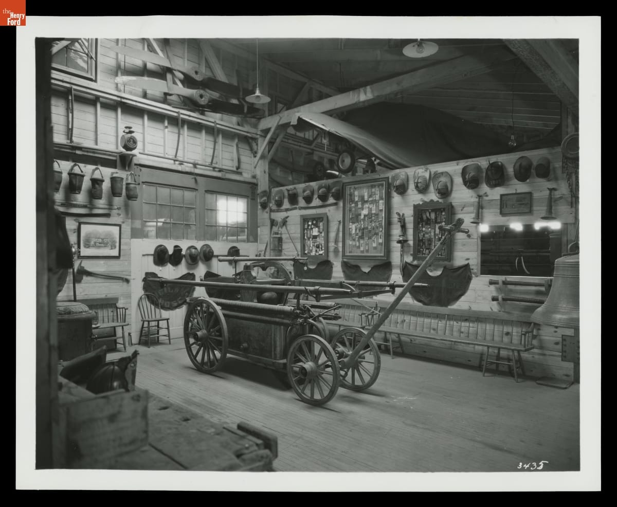 Firefighting equipment was an early focus of collecting efforts at The Henry Ford. This photograph shows a mock-up for a firefighting exhibit tested at Ford Motor Company's Engineering Laboratory -- where Henry Ford stored many of his artifacts before the museum opened. Buckets, helmets, trumpets, and tools are all visible in the display.