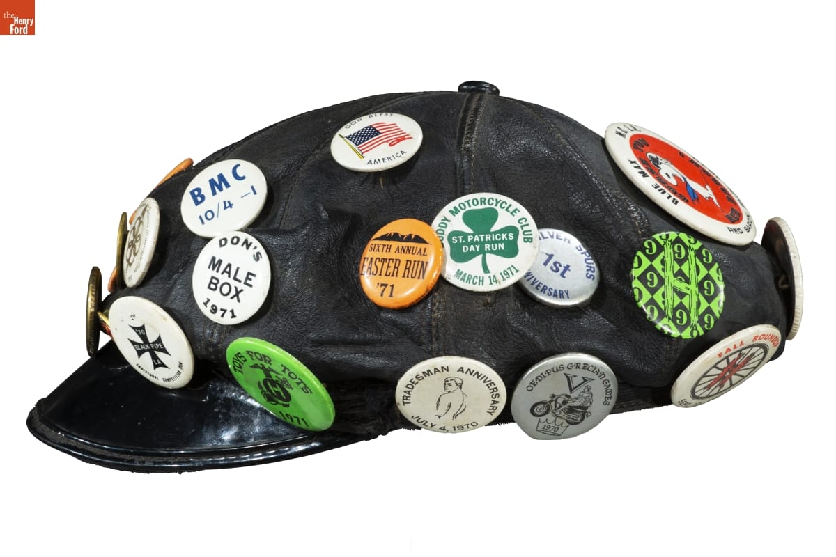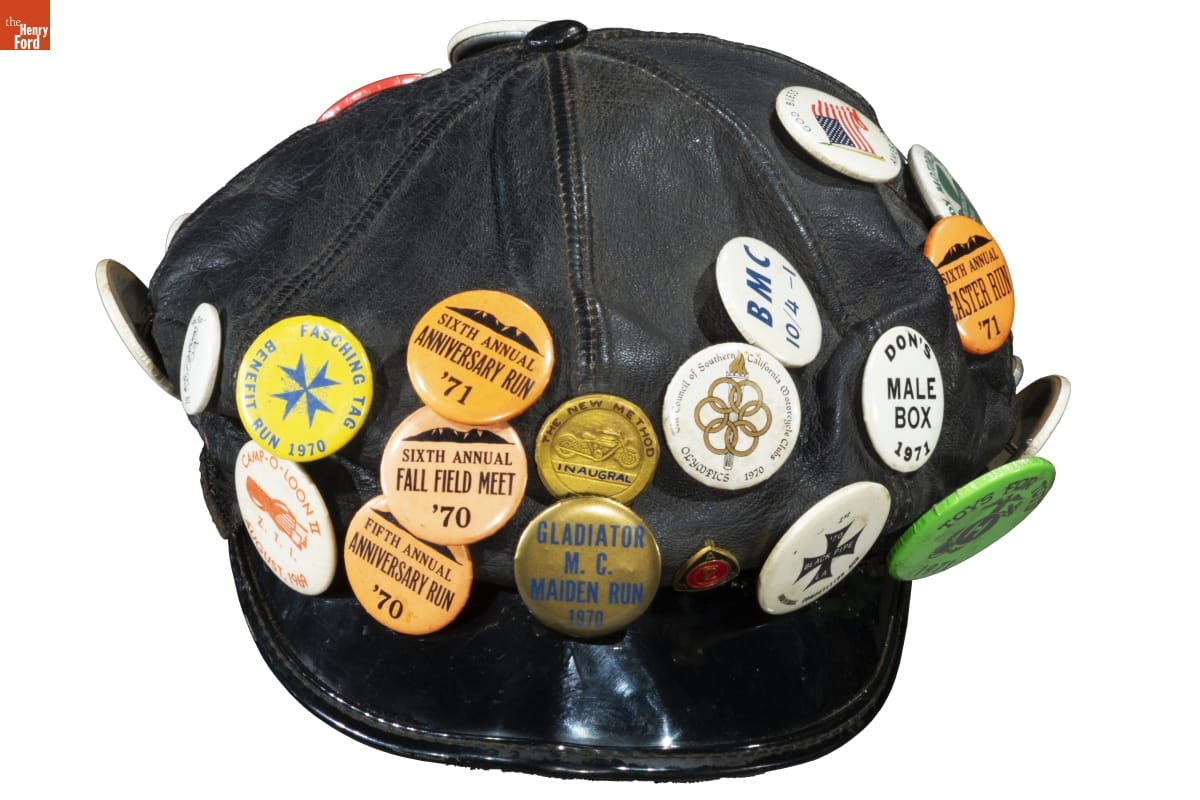 Motorcycle Cap with Buttons Commemorating LGBTQ+ Events and Places, 1969-1971