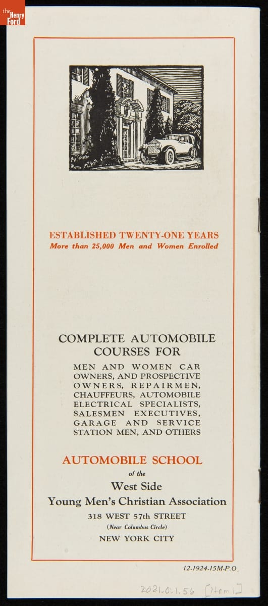 Driver education did not become a regular part of American high schools until the 1930s. Prior to that, young drivers -- or older first-time drivers -- could take instructional courses offered by automobile dealers or community organizations. This brochure advertised a course offered by a YMCA in New York City. Early courses often taught auto care and maintenance as well as driving.