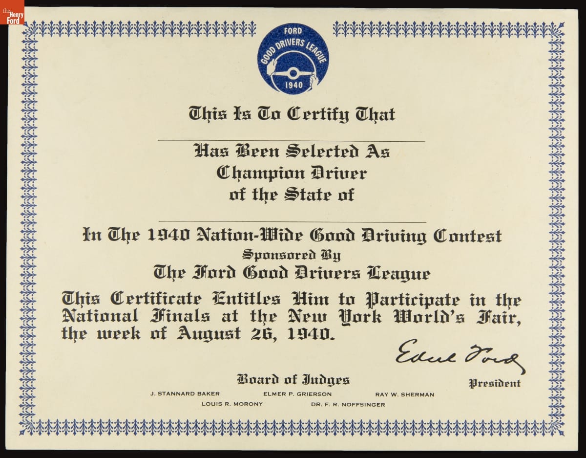 Ford Good Drivers League State Champion Driver Certificate, 1940