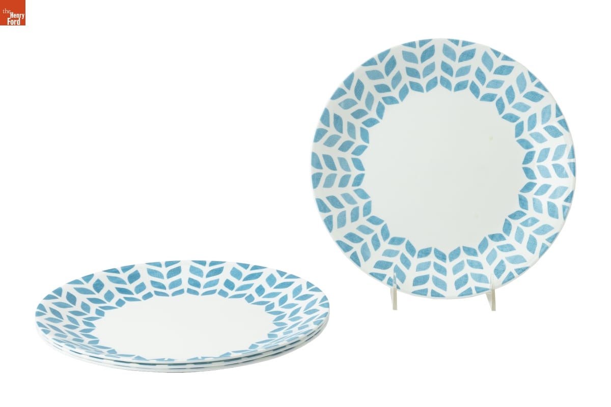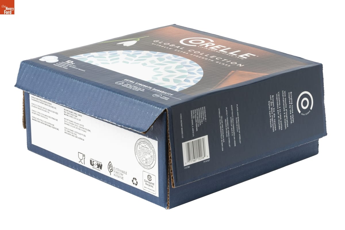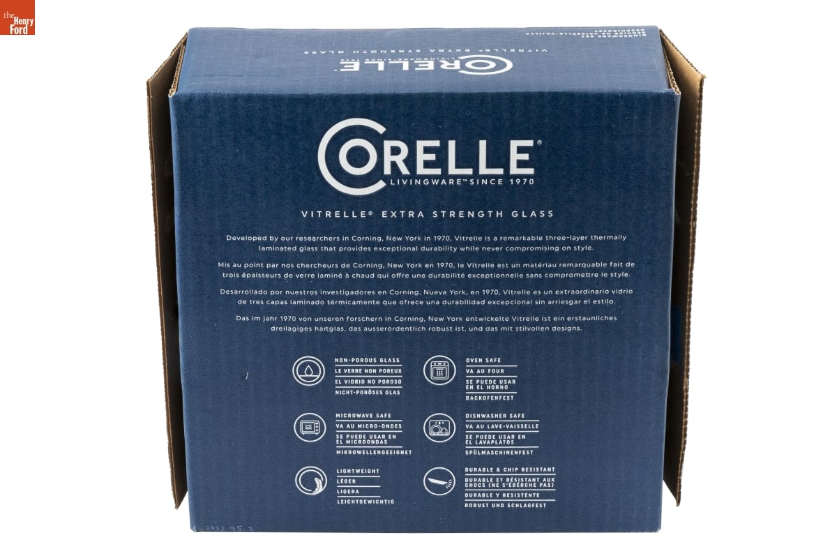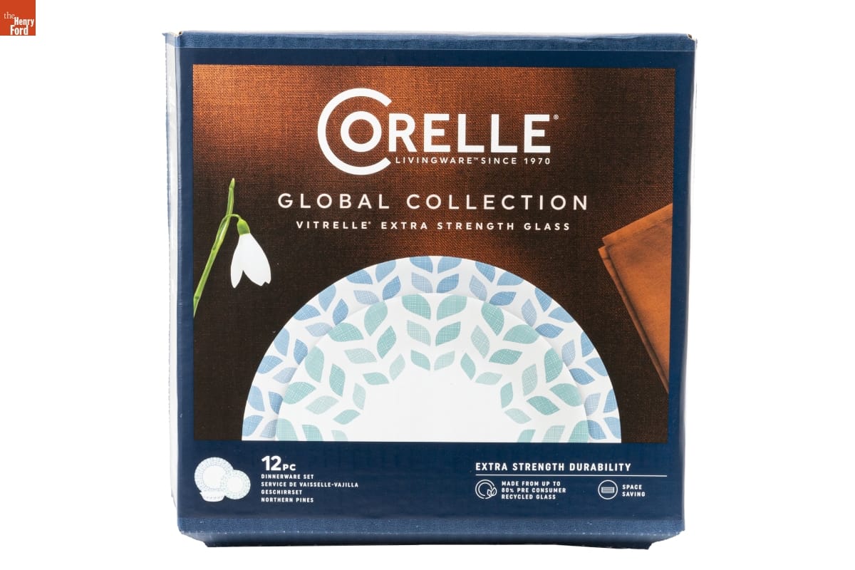 on top of packaging: CORELLE(R) / LIVINGWARE[TM] SINCE 1970 / VITRELLE(R) EXTRA STRENGTH GLASS / DINNERWARE SET / [...] on front of packaging: CORELLE(R) / LIVINGWARE[TM] SINCE 1970 / GLOBAL COLLECTION / VITRELLE(R) EXTRA STRENGTH GLASS / 12 PC / DINNERWARE SET / [...] / NORTHERN PINES / EXTRA STRENGTH DURABILITY / MADE FROM UP TO / 80% PRE CONSUMER / RECYCLED GLASS / SPACE / SAVING on back of packaging: CORELLE(R) / LIVINGWARE[TM] SINCE 1970 / VITRELLE(R) EXTRA STRENGTH GLASS / Developed by our researchers in Corning, New York in 1970, Vitrelle is a remarkable three-layer thermally / laminated glass that provides exceptional durability while never compromising on style. / [...] on side of packaging: CORELLE(R) / LIVINGWARE[TM] SINCE 1970 / GLOBAL COLLECTION / 4 / DINNER PLATES / [...] / 4 / SALAD/SIDE PLATES / [...] / 4 / SOUP/CEREAL BOWLS / [...] on side of packaging: CO SINCE 1970 / Bringing home styles / inspired by the world. / [...] / PLATES AND BOWLS MADE OF VITRELLE(R) / GLASS IN U.S.A. / [...] on bottom of packaging: CORELLE AND VITRELLE ARE REGISTERED / TRADEMARKS OF INSTANT BRANDS HOLDINGS INC. / [...]