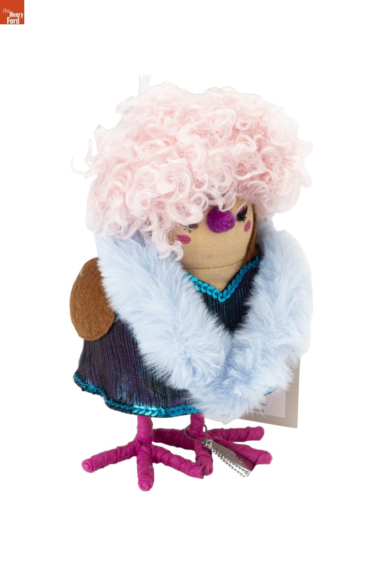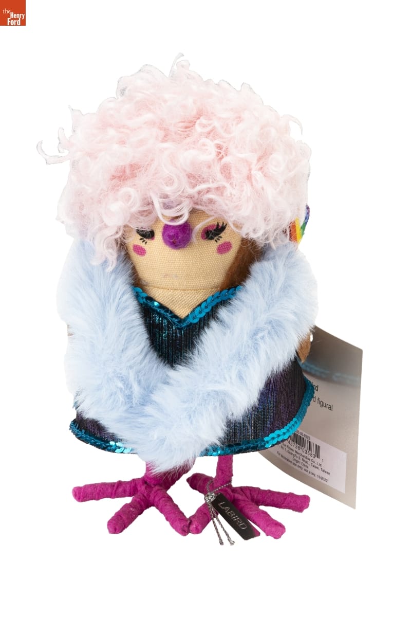 on front of attached product tag: PRIDE on back of attached product tag: pride bird / drag queen bid figural 335-03-9323 / 0 42738 03583 1 / Sun Flower Merchandise Co., Ltd. / 7F., No. 1, GuangFu S. Road., Taipei, Taiwan / Origin: China / For decorative use only, not a toy. 10/2022 on front of metal tag on chain around foot: 2023 on back of metal tag on chain around foot: LABIRD