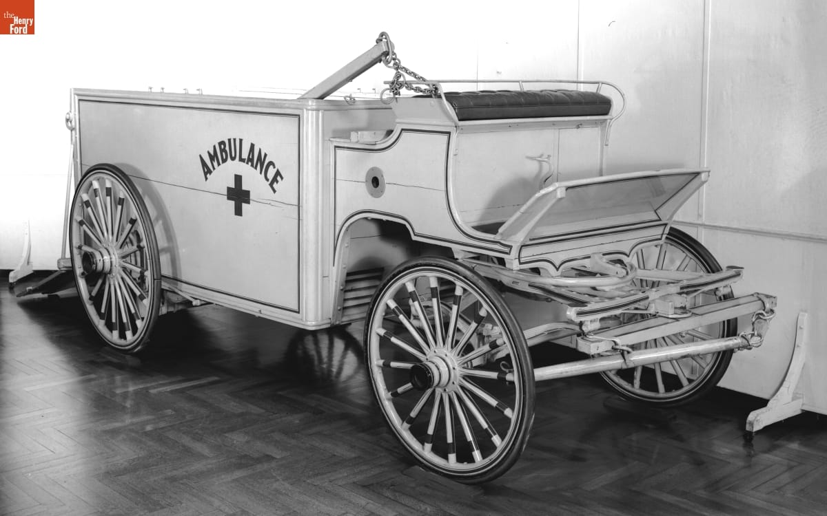 Horses and mules were everywhere on 19th century American streets pulling cabs, carriages, streetcars, and commercial vehicles. This ambulance wagon, used by Detroit veterinarian Elijah Patterson, transported sick or injured draft animals for medical treatment. The wagon bed was lowered toward the street with a winch, which then pulled the bed -- complete with animal -- back into the wagon.