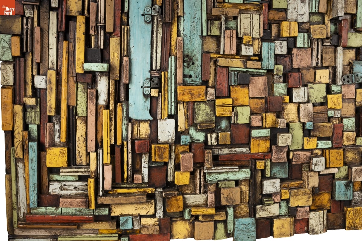 New Orleans artist Jean-Marcel St. Jacques creates "wooden quilts" like this one using wood and other debris from his Hurricane Katrina-damaged home. The style of his work honors both his quilter great-grandmother – to whom this piece is particularly dedicated – and his great-grandfather, who was a junk collector and hoodoo practitioner.
