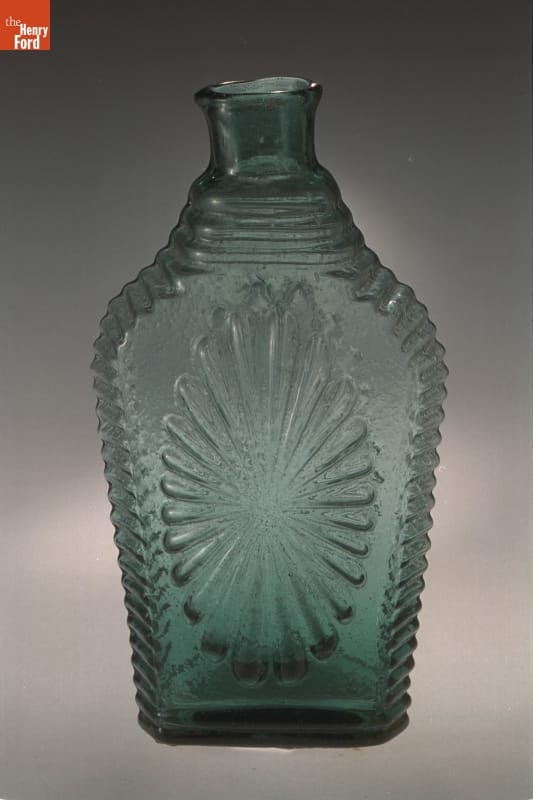 Glass factories in America began producing inexpensive, mold-formed flasks in the early 1800s. These figured flasks, often embellished with symbols of national pride or political or cultural affiliation, appealed to America's common man. Purely decorative flasks, however, were another option. These flasks -- like this sunburst-pattern one -- held alcohol just as well as those with images of great men or patriotic emblems.