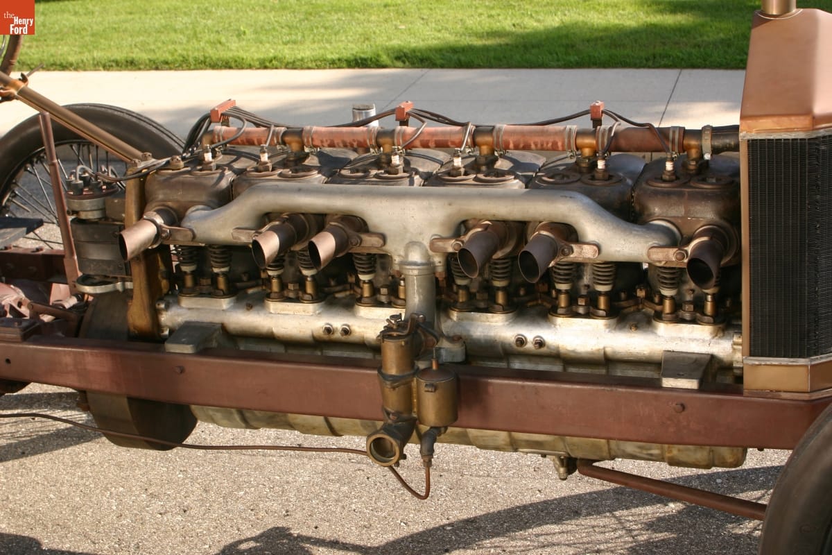This is one of Henry Ford's least successful race cars. Built in 1907, it used a six-cylinder engine from the Ford Model K passenger car, and Henry called it "666." Ford built the car to break the existing record of 51-3/5 seconds for one lap of a one-mile track. However, a right rear tire failed at the Michigan State Fairgrounds and "666" took driver Frank Kulick through the wall surrounding the track. Kulick walked with a limp for the rest of his life, and "666" never raced again.
