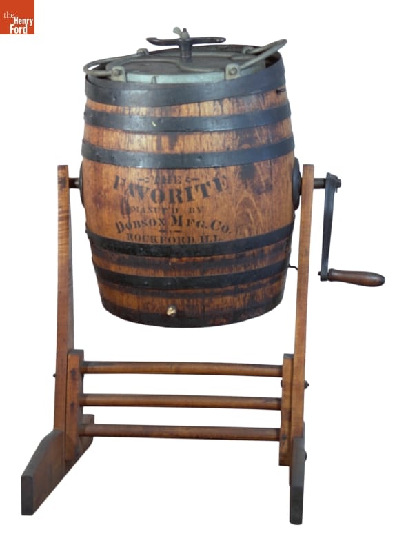 This barrel churn was made by the Dobson Manufacturing Company of Rockford, Illinois. Users placed cream inside the barrel, closed the lid then turned the crank… and kept turning! "The Favorite" -- as the company named it -- relied on an end-over-end motion to agitate the cream and make butter.