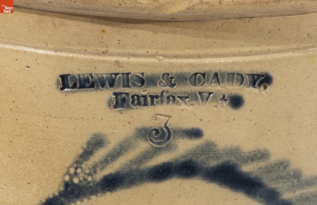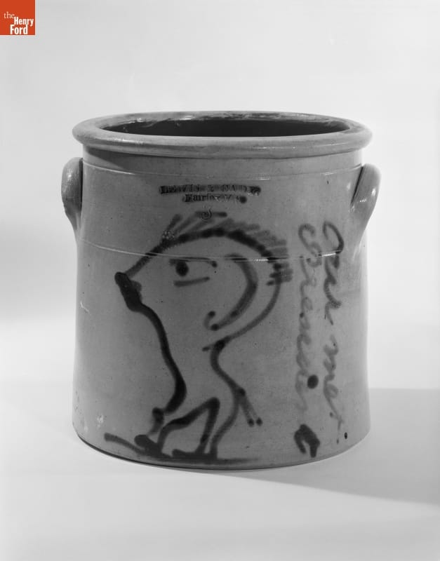 This crock was made of a durable, leak-proof pottery called stoneware. The orange-peel-like outer glaze was created when the potter threw handfuls of common rock salt into a white-hot kiln during the piece's firing. Salt-glazed stoneware pieces were decorated with an array of designs, including this caricatured image of Democratic candidate Stephen Douglas from the 1860 Presidential campaign.
