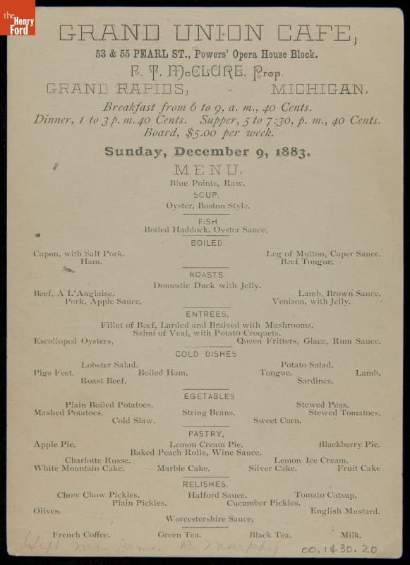 Trade Card with Menu for Grand Union Cafe, Sunday, December 9th, 1883