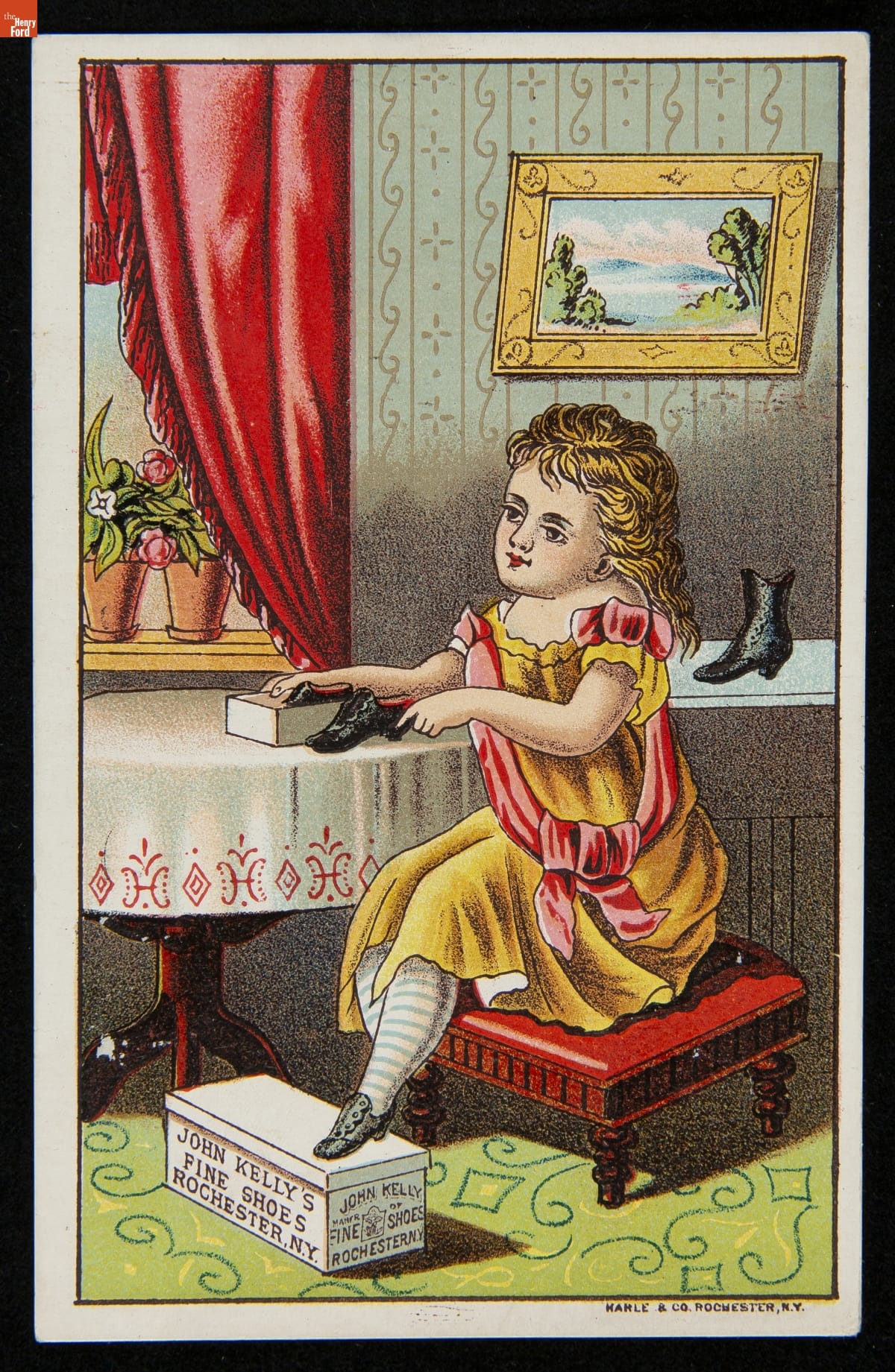 As color printing gained momentum in the late 19th century, trade cards became a major means of advertising goods and services. Americans enjoyed and often saved the little advertisements found in product packages or distributed by local merchants. This trade card is for John Kelly's Fine Shoes.
