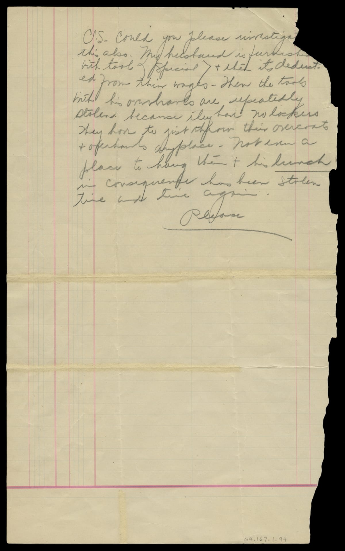P.S. Could you please investigate this also. My husband is furnished with tools (special) & then its deducted from his wages--Then the tools with his overhauls [sic] are repeatedly stolen because they have no lockers. They have to just throw their overcoats & overhauls [sic] anyplace. Not even a place to hang them & his lunch in consequence has been stolen time and time again. Please