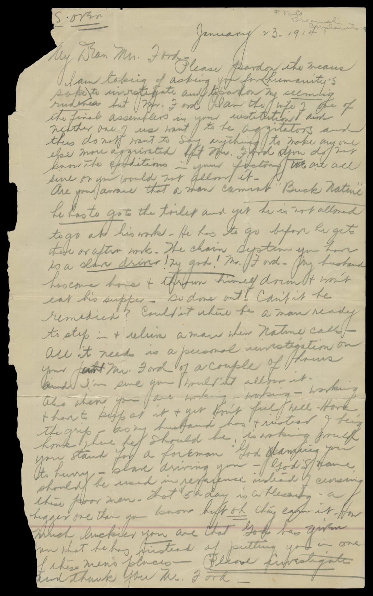 Letter written to Henry Ford from the wife of an assembly line worker, January 23, 1914. The woman writes asking Henry Ford to investigate the situation on the assembly lines in the factories with regard to working conditions. She is angry about the treatment her husband receives on the job.