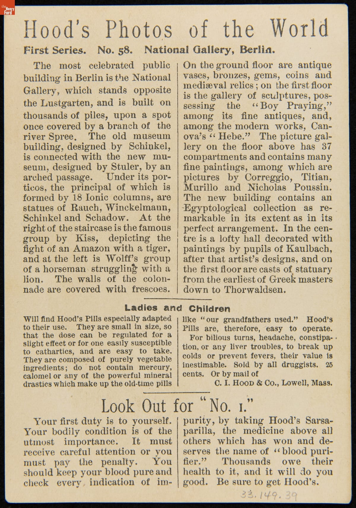 Trade Card for C.I. Hood & Co. with Hood's Photos of the World, "National Gallery, Berlin," 1890-1910