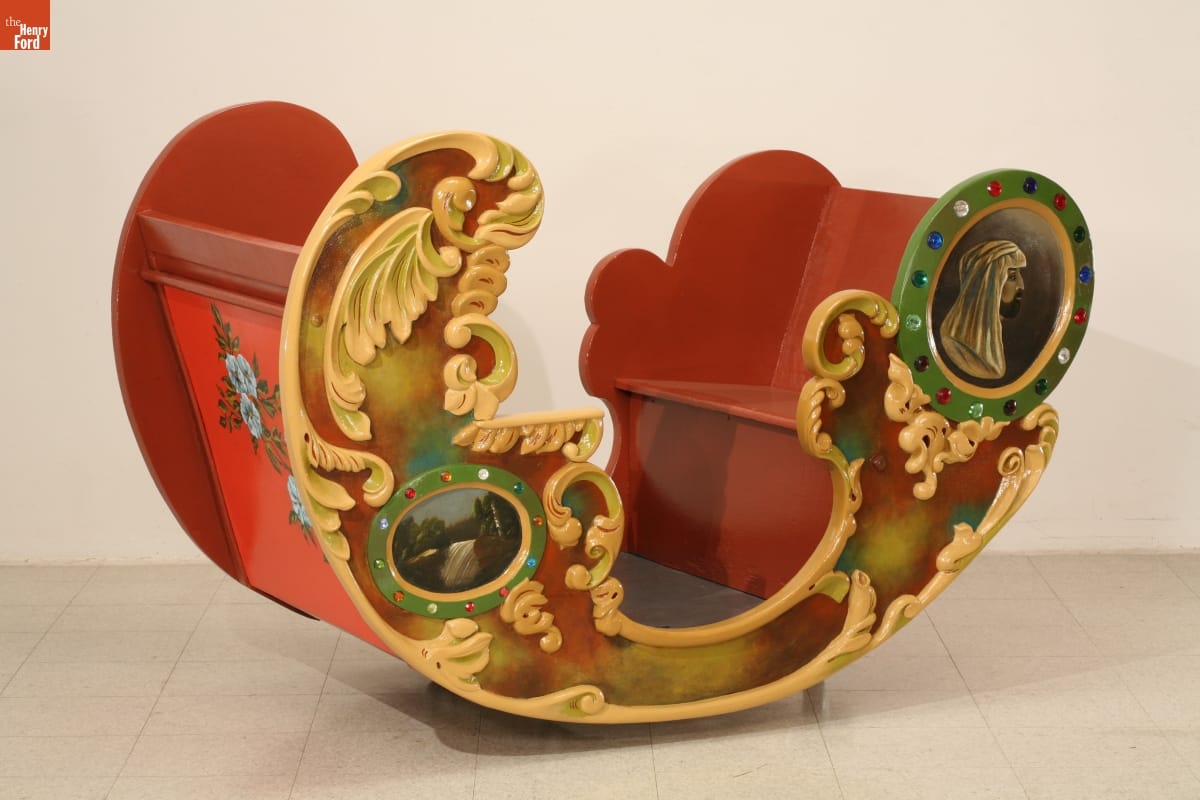 This hand-carved rocking "chariot" was made by the Herschell-Spillman Company, the largest U.S. carousel manufacturer between 1904 and 1920. Carousels were extremely popular in amusement parks and seaside resorts at this time. The seat was designed to rock back and forth as the carousel revolved. It is part of an operating carousel in Greenfield Village.