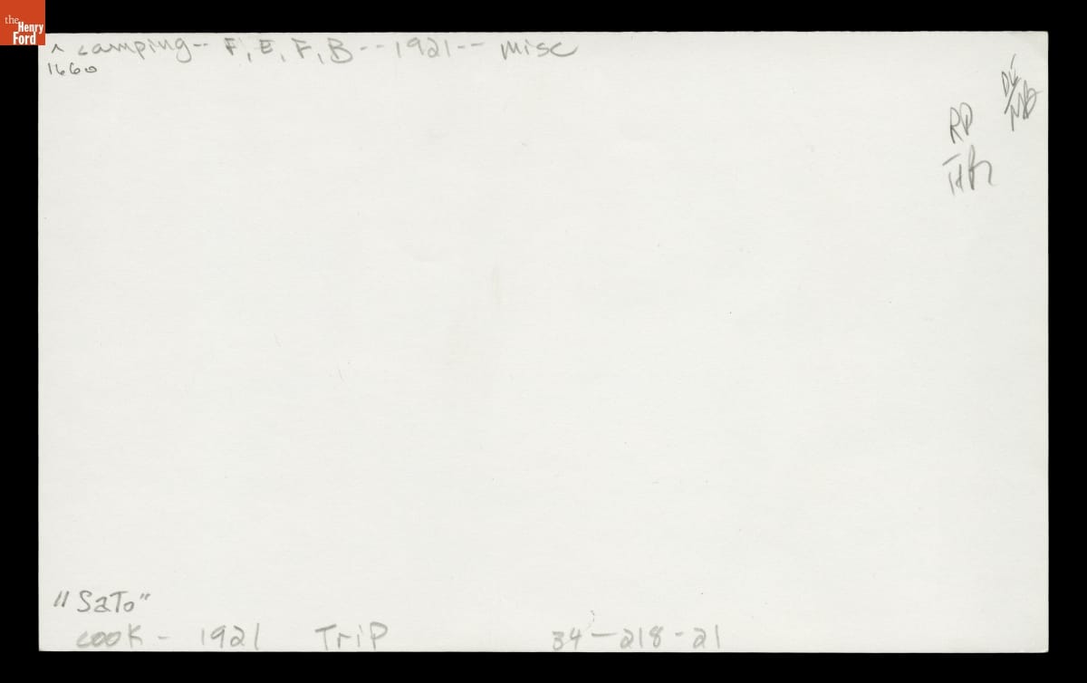 Calling themselves the Vagabonds, Henry Ford, Thomas Edison, Harvey Firestone, and John Burroughs embarked on numerous camping trips between 1916 and 1924. Various support staff were needed to maintain camp including Ford's personal chef and butler, Thomas Sato. Sato accompanied Mr. Ford on nearly all of his camping excursions, becoming a favorite among the other Vagabonds.