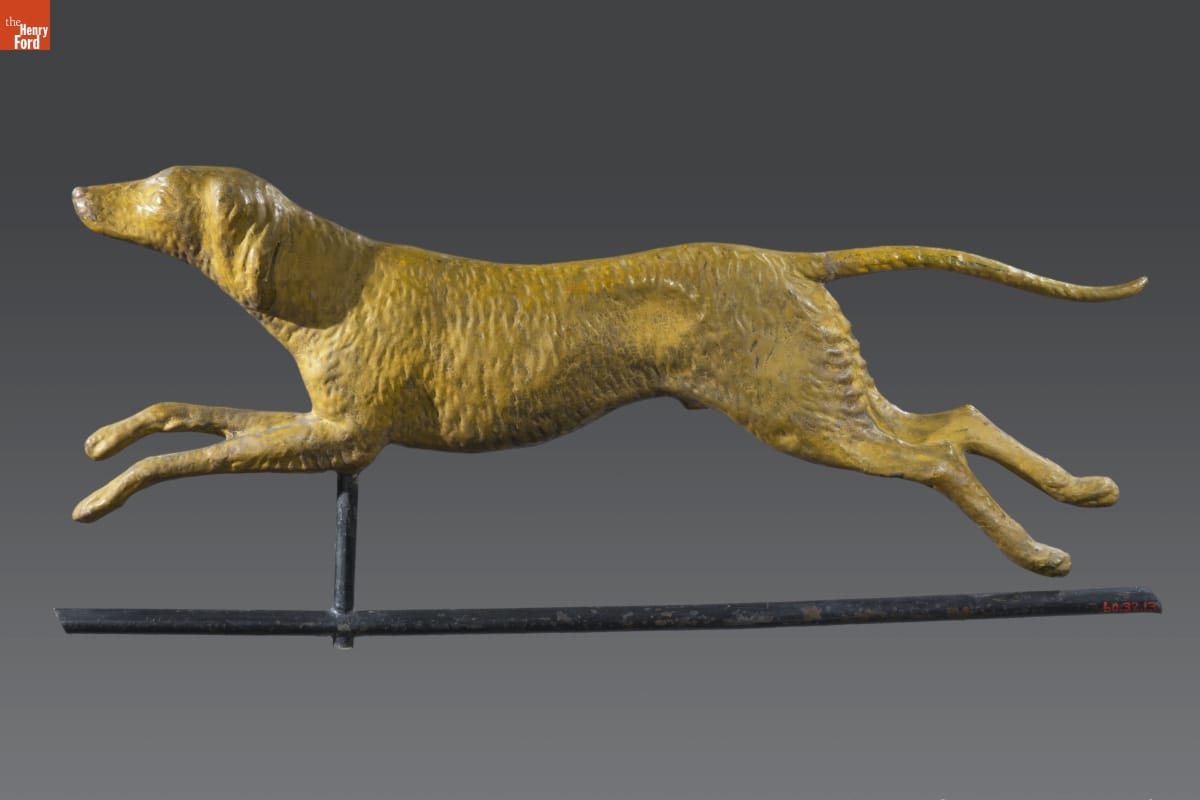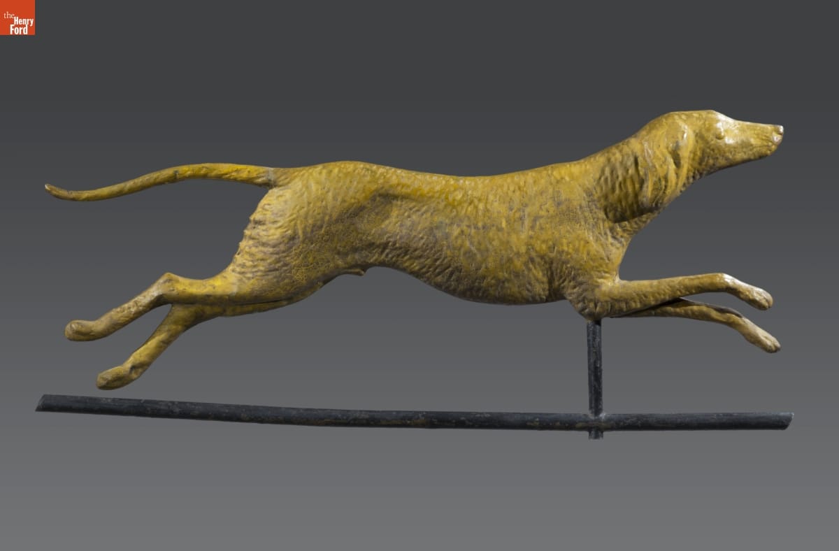 Weathervanes point into the direction of the wind. This helped viewers anticipate weather changes before local forecasts became common after 1920. Functional weathervanes required a basic pointing device and directional arms, but manufacturers added decorative elements, or ornaments, to appeal to consumer interests. Domestic and wild animals in motion, as if running or jumping through the air, were popular.
