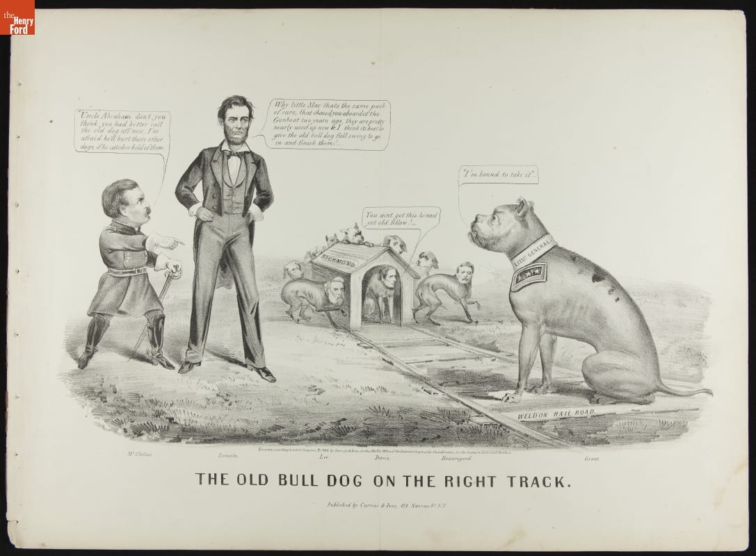 below scene: Entered according to Act of Congress AD 1864, by Currier & Ives, in the Clerk's Office of the District Court of the United States, for the Southern District of New York. / McClellan Lincoln Lee Davis Beauregard Grant at bottom: THE OLD BULL DOG ON THE RIGHT TRACK. / Published by Currier & Ives, 152 Nassau St. N.Y.