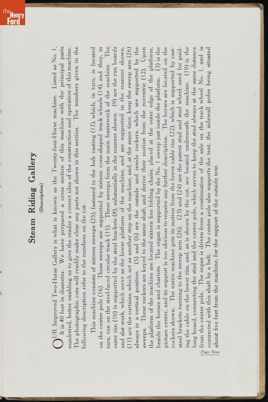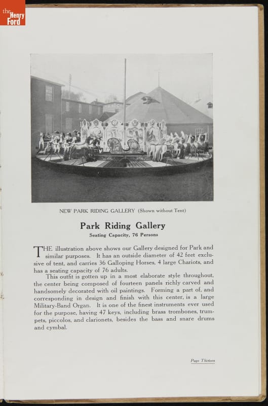 This catalog highlights the products of Herschell-Spillman Company, from portable merry-go-rounds to large stationary "carousselles." This company, one of the most popular and successful American carousel manufacturers of the early 20th century, combined a method of shop production to produce carved wooden animals with their expertise in steam engines and boilers for efficient operation of their merry-go-rounds and carousels.